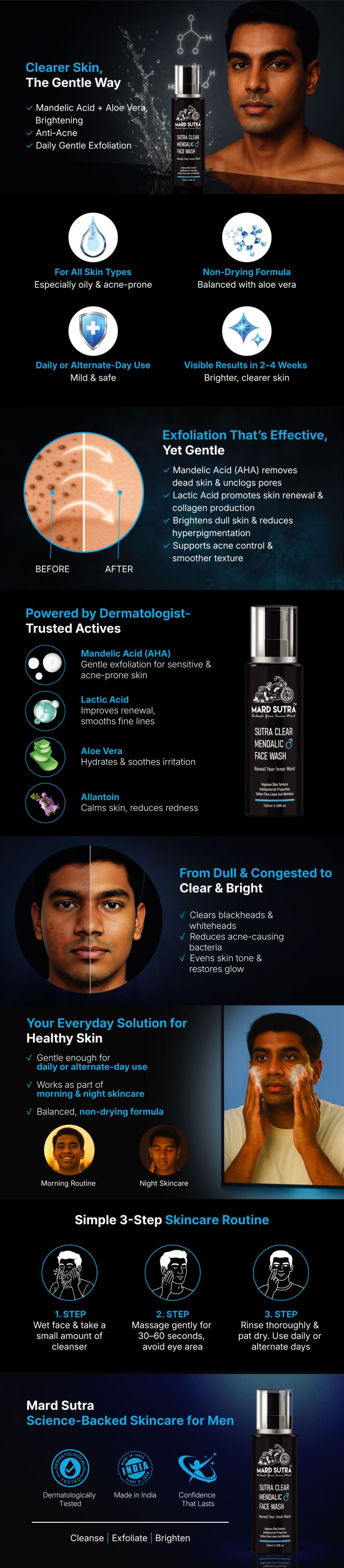 Say goodbye to clogged pores, excess oil, and dullness — without stripping your skin. Mard Sutra Mendelic Acid Face Wash combines Mandelic Acid, Lactic Acid, and Aloe Vera to gently exfoliate, unclog pores, and brighten skin tone while keeping it hydrated and calm. Its non-drying, pH-balanced formula is suitable for daily or alternate-day use, especially for oily, acne-prone, and sensitive skin. With consistent use, enjoy clearer, smoother, and more even-looking skin in just weeks.